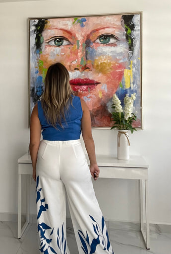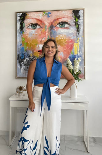 Mykonos Dream Set – Inspirado en la frescura y elegancia del Mediterráneo, este look es perfecto para la temporada. Pantalón blanco con estampado floral en la parte baja, cintura elástica y cierre lateral para un ajuste cómodo y favorecedor. El top en azul royal aporta un toque vibrante y sofisticado. Lo llevo en talla Large y me queda perfecto. Ideal para cualquier ocasión, desde un paseo junto al mar hasta una salida especial. ¡Luce radiante con este set!