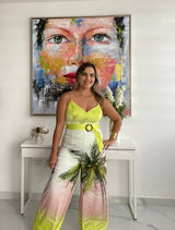 Fluye con elegancia en nuestro Palm Satin Jumpsuit, una pieza sofisticada y fresca. Su tela satinada y su diseño largo crean un efecto fluido y estilizado. Destaca su hermosa palma al frente, agregando un toque tropical y chic.
