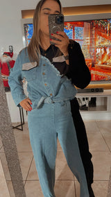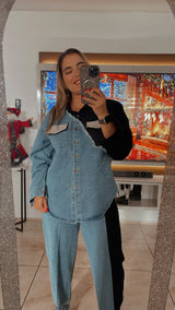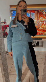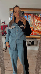 Descubre el estilo único de Stella set, una combinación de denim y negro con detalles de brillo en sus bolsillos. Con un diseño a la moda y cómodo, este conjunto es perfecto para destacar en cualquier ocasión. ¡Únete a la tendencia con Stella!
