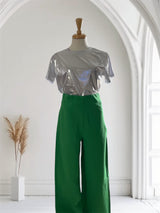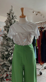 Long green pants with a bit of elastic at the waist and a zipper on the side. Runs true to size, perfect for work, pairing with a jacket or going out. With a blouse, sneakers or heels. Perfect for you, you can wear it in different ways. You need it!