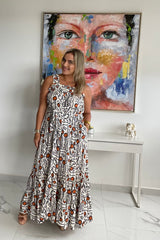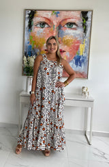 Sunset Maxi Dress, Un vestido en tonos crema, azul y anaranjado que grita verano. One size — se adapta desde X-Small hasta X-Large. Súper cómodo, con bolsillos y un largo perfecto que te hará sentir libre y fabulosa.