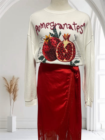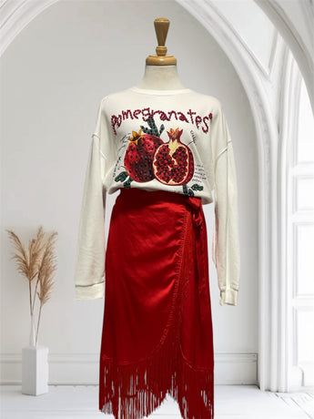 Red fringe skirt for a chic and modern look. Made from high quality material for maximum comfort. Add a fun touch to any outfit with this vibrant red skirt that features fringes at the bottom of the skirt. Designed with a midi cut for a flattering fit. It is definitely an eye-catcher.