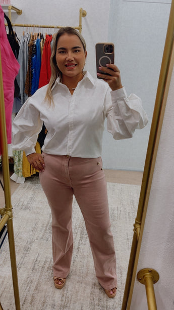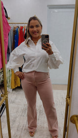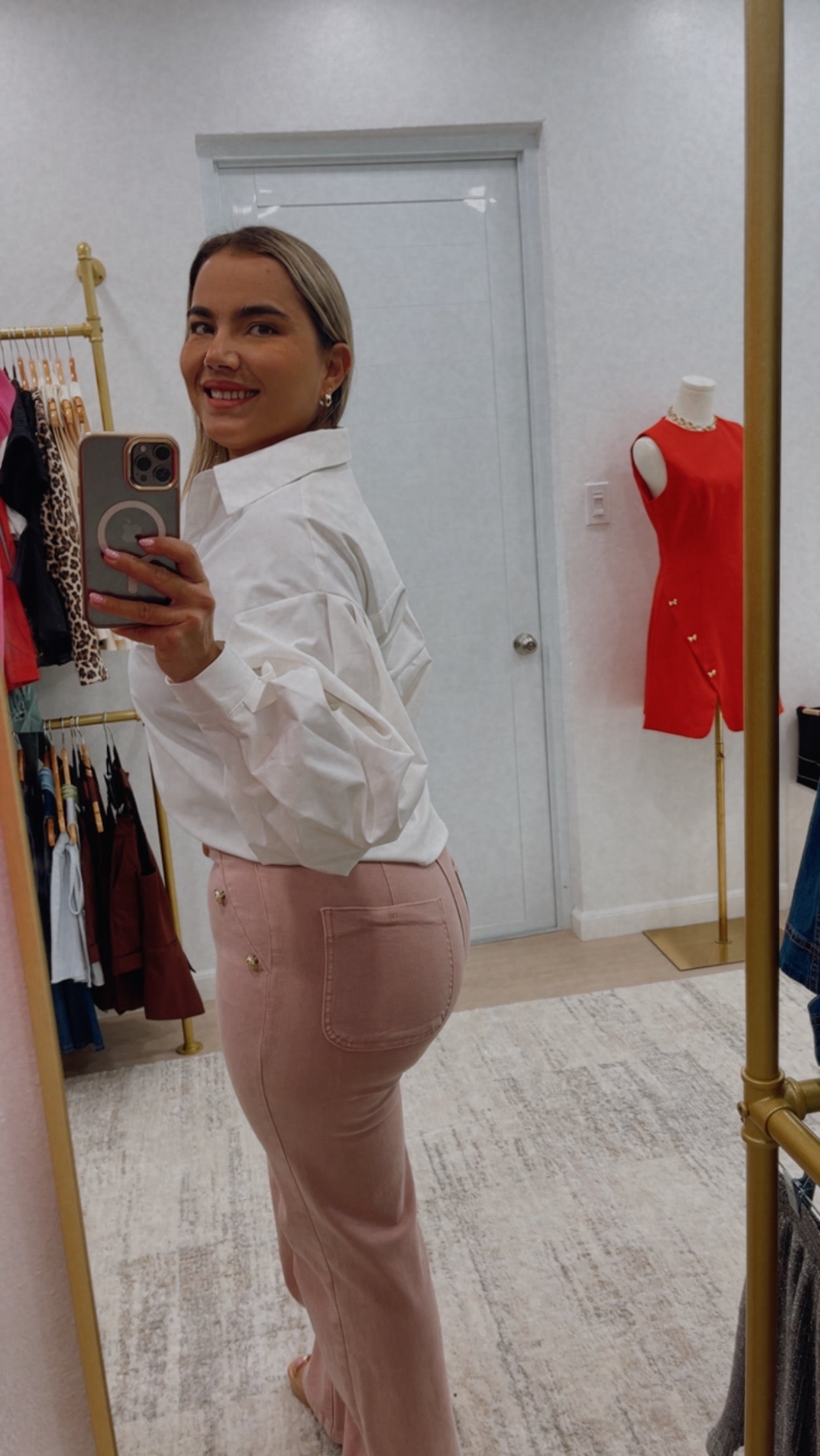 Adriana Blush Pant: Pantalón en tono blush rosa viejo, elegante y versátil, con botones dorados que realzan el diseño y le dan un toque sofisticado. De tiro alto, corte favorecedor y tela súper suave con stretch, estiliza la figura y se siente sumamente cómodo al llevarlo.