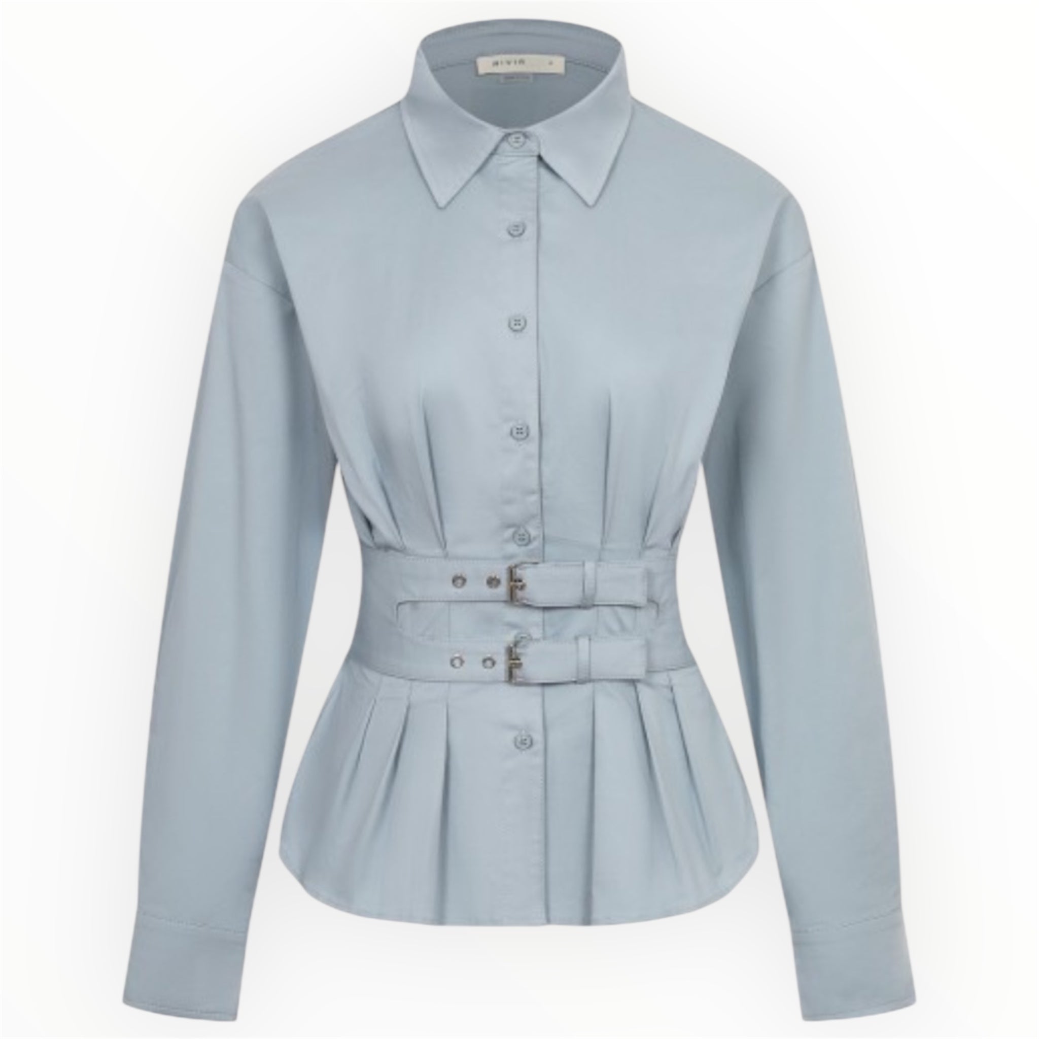 Blusa color light blue de corte moderno con correas que definen la cintura. Versátil y chic, ideal para un look de oficina o para elevar tu estilo casual con elegancia.