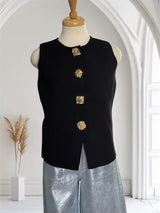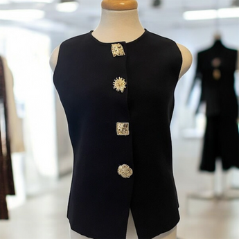 Vest color negro de diseño moderno, con botones dorados únicos que resaltan su estilo. Corte sofisticado que realza tu figura. Perfecto para un look chic, versátil y elegante. Ideal para cualquier ocasión. Definitivamente lo amarás.